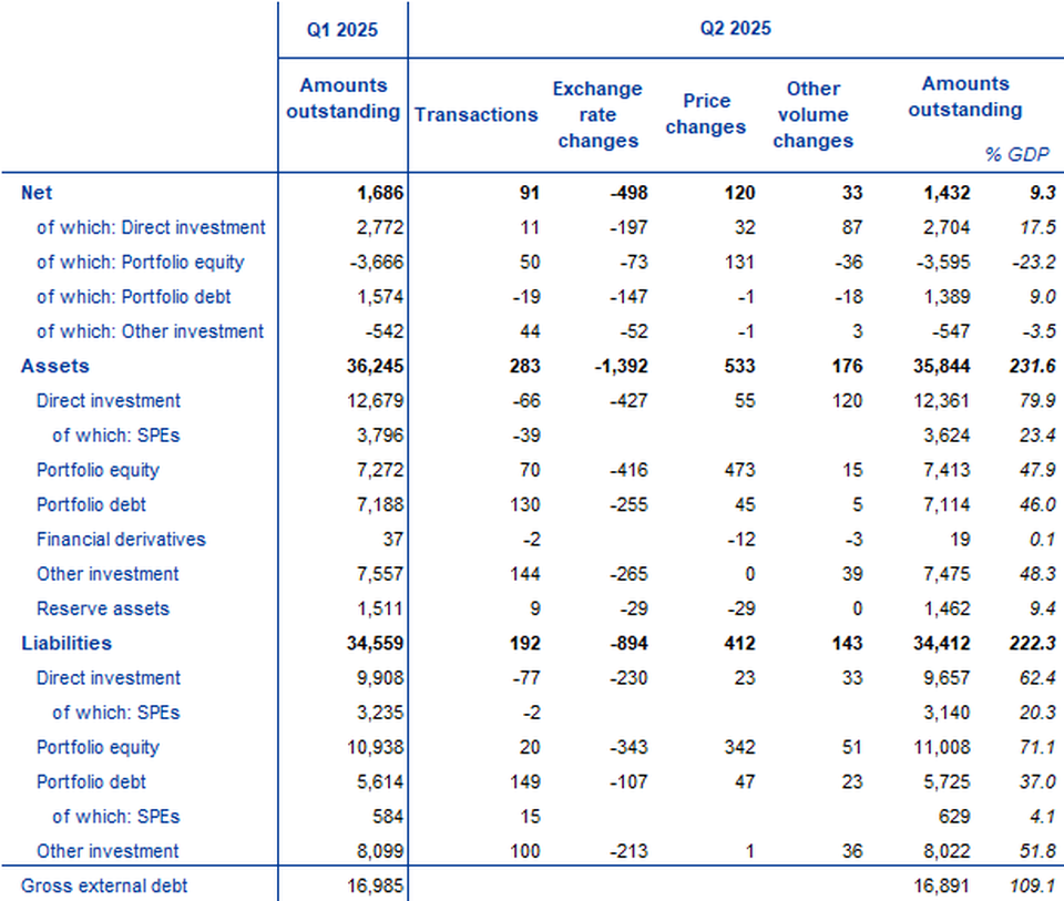 - International investment position showed net assets of €1.43 trillion (9.3% of euro area GDP) at end of second quarter of 2025
