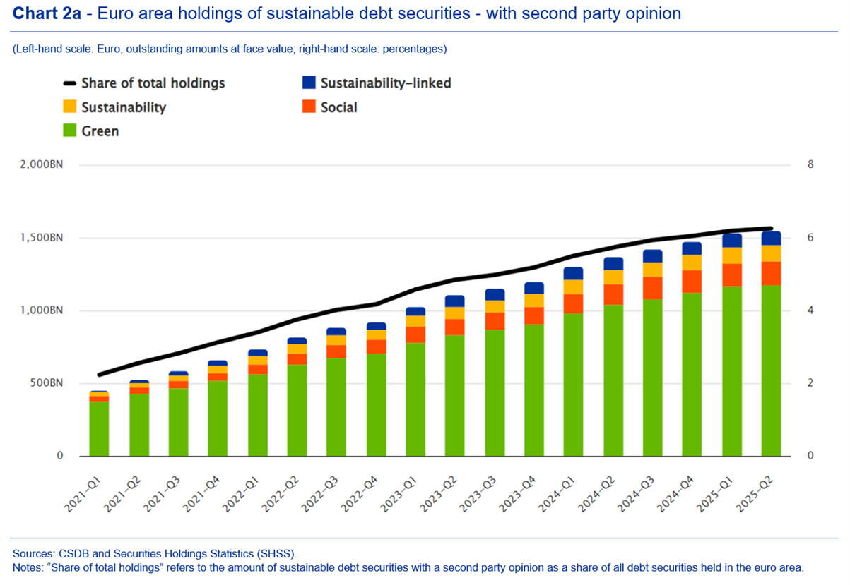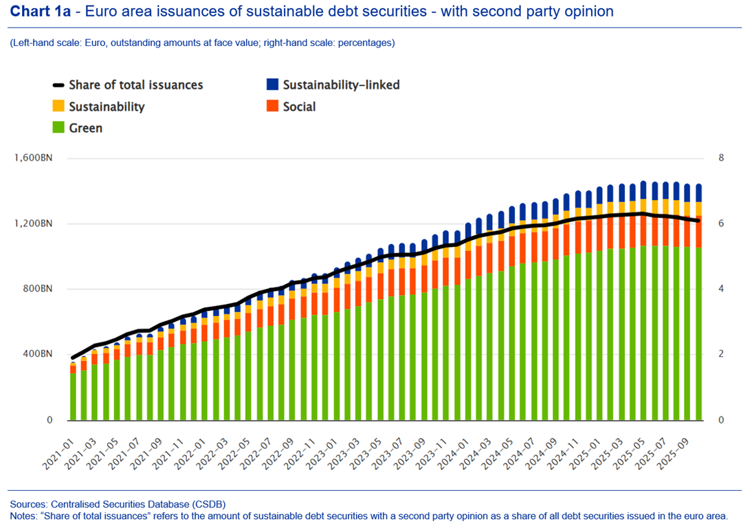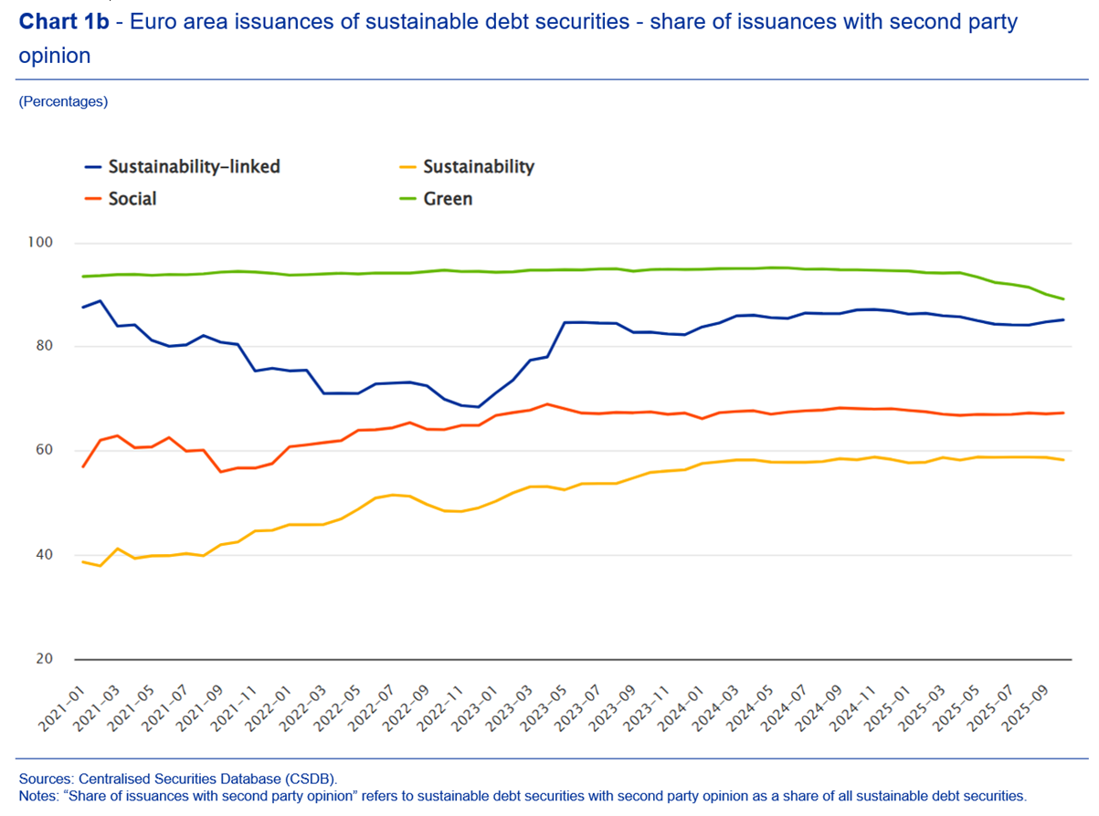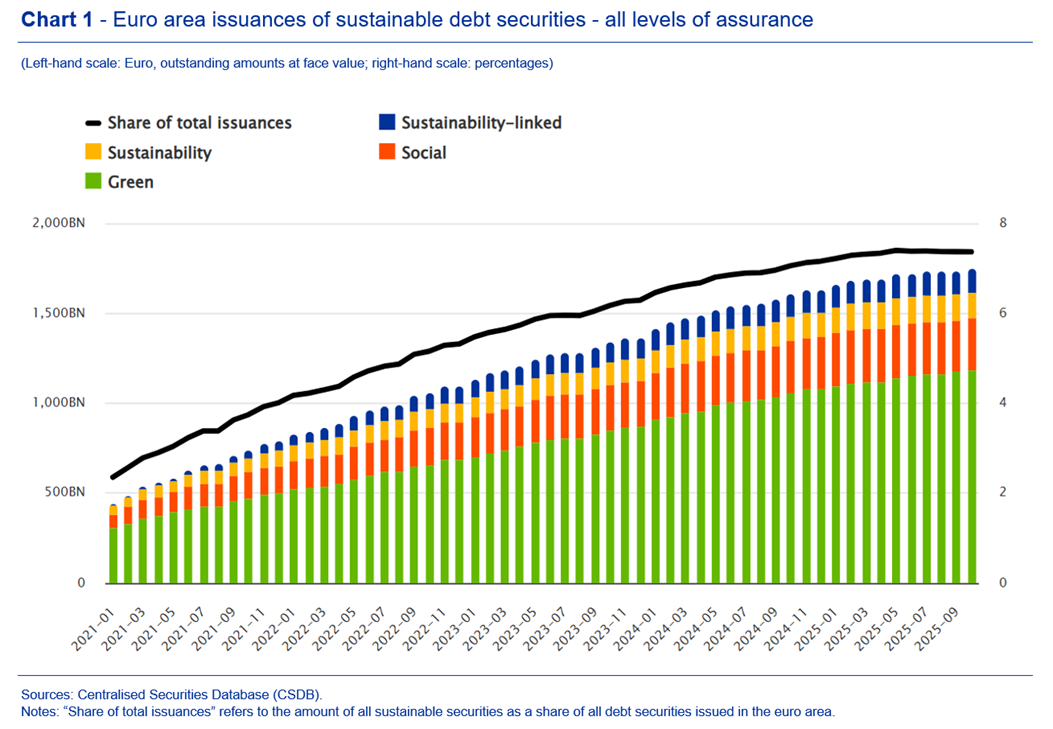 Since November 2023, data on sustainable debt securities are published for two levels of assurance: i) instruments with a second party opinion validating the sustainability claims of the issuer, and ii) all sustainable instruments, i.e. with all degrees of assurance, including only self-labelled instruments. As of September 2024, additional series have been added to the indicators, which are published as official ESCB statistics. Since November 2025, new aggregates on the issuances of sustainable debt securities have been published to also serve reporting requirements in the context of the G20 Data Gaps Initiative Recommendation 4 on Climate Finance (by maturity, by currency and interest rate type).
