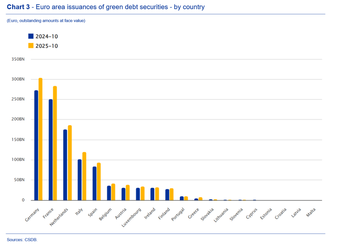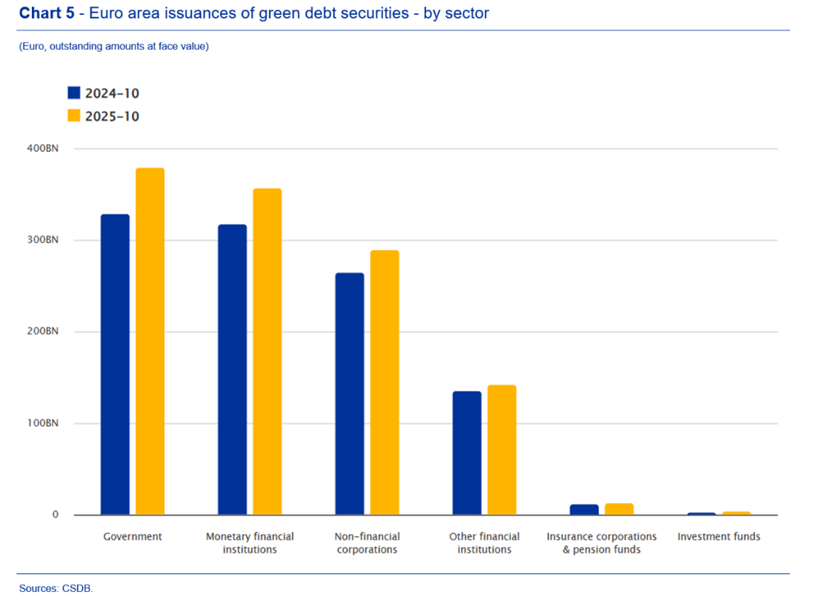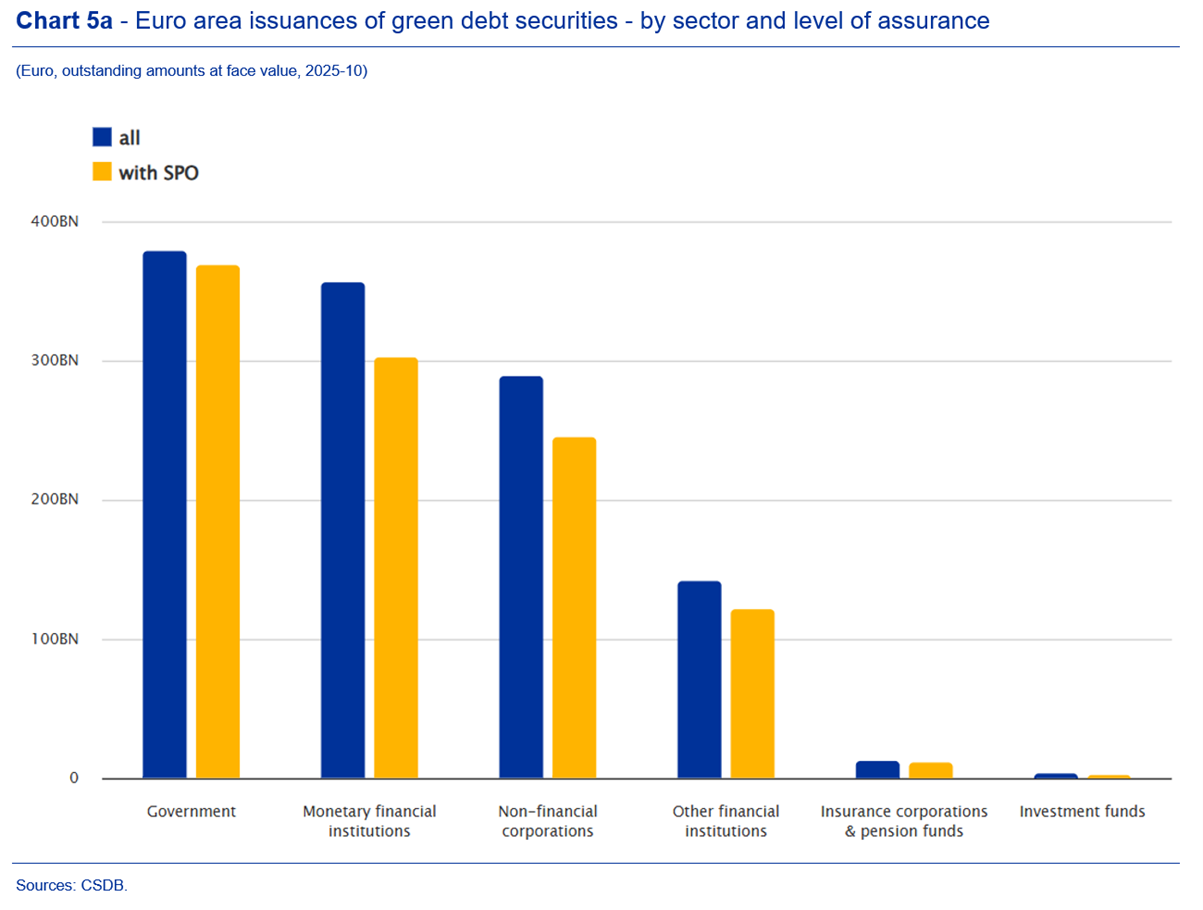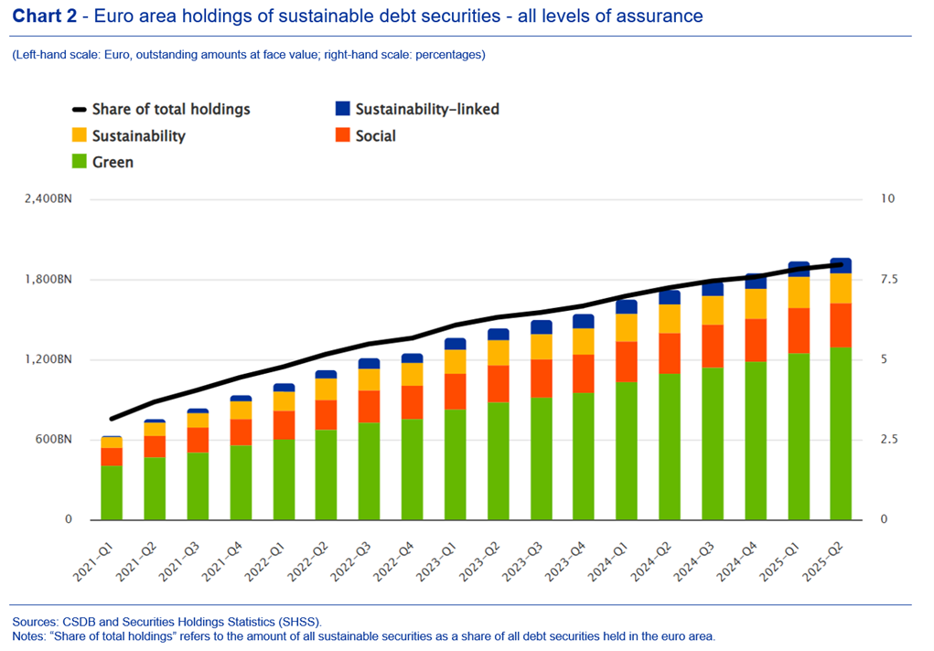 Since November 2023, data on sustainable debt securities are published for two levels of assurance: i) instruments with a second party opinion validating the sustainability claims of the issuer, and ii) all sustainable instruments, i.e. with all degrees of assurance, including only self-labelled instruments. As of September 2024, additional series have been added to the indicators, which are published as official ESCB statistics. Since November 2025, new aggregates on the issuances of sustainable debt securities have been published to also serve reporting requirements in the context of the G20 Data Gaps Initiative Recommendation 4 on Climate Finance (by maturity, by currency and interest rate type).