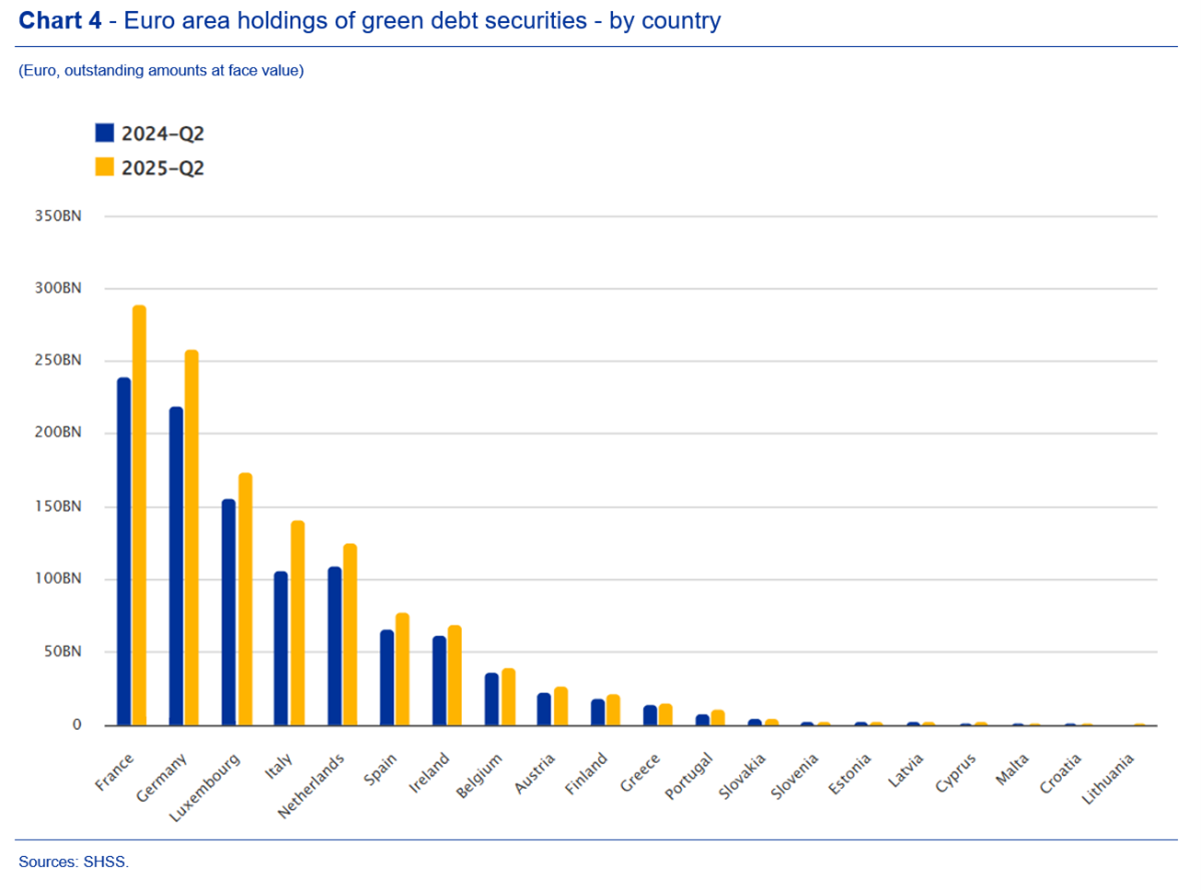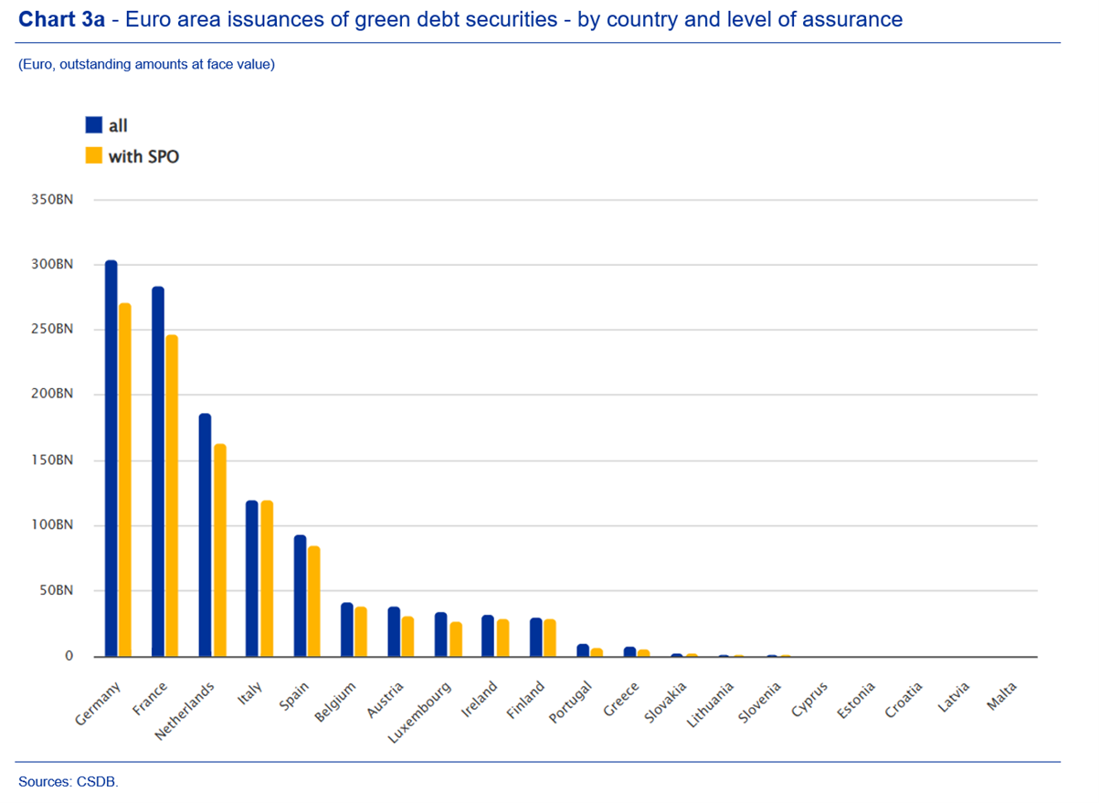 France and Germany are the top issuers and holders of green debt securities in the euro area, accounting for more than half of the market in these instruments (Chart 3 and Chart 4). The Netherlands is the third-largest issuer and Luxembourg the third-largest holder. The remaining euro area countries account for a small share of both green bond issuances and holdings, with some countries having only recently entered the market or being yet to enter. This is equally true for green debt securities with a second party opinion.