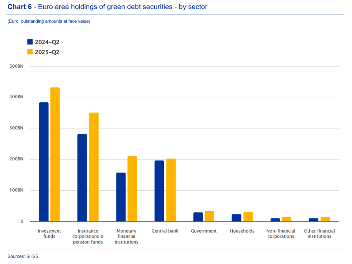 Governments, monetary financial institutions and non-financial corporations lead the way in the issuance of green debt securities in the euro area (Chart 5). Virtually all green bonds issued by euro area governments have obtained a second party opinion, highlighting the importance of meeting the growing market demand for independent external reviews of the alignment of labelled green bonds with international standards and of the expected contribution of the financed projects to climate outcomes. Likewise, most green bonds issued by other sectors have obtained a second party opinion. With regard to holdings of green debt securities by euro area residents, investment funds are the main market players, followed by insurance corporations and pension funds, together with central banks. The remaining sectors play a very residual role, with households entering the green debt market only indirectly, through investment funds. As is the case with issuances, most green bonds held across all sectors have a second party opinion.
