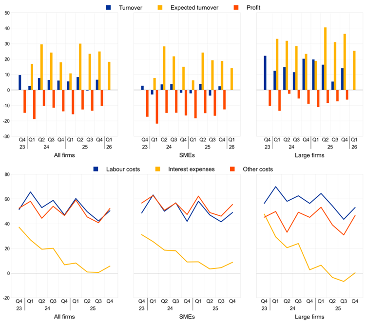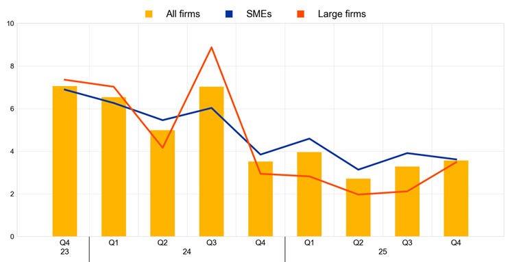 Firms continued to signal a deterioration in profits. A net 10% of firms reported a decline in profits in the fourth quarter of 2025, compared with 13% in the third quarter. The decline was more widespread among SMEs than among large firms.