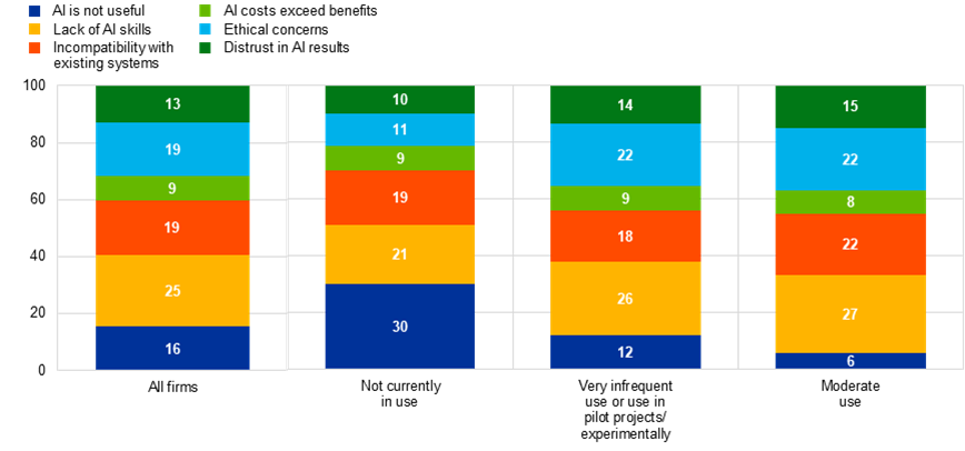 The most common reason firms cite for not adopting AI is a lack of AI skills, mentioned by 25% of respondents (Chart C). Additionally, some firms point to incompatibility with existing systems, ethical concerns or a perceived lack of usefulness of AI (19%, 19% and 16% respectively). Fewer firms express distrust in AI-generated results or believe that the costs of AI outweigh its benefits (13% and 9% respectively). A large share of firms not currently using AI indicate that AI is not useful for their business (30%), while this is much less prevalent among those firms which use AI very infrequently or moderately (12% and 6% respectively). For firms using AI to some extent, a lack of AI skills remains the most frequently cited barrier, with 26% of infrequent users and 27% of moderate users highlighting this challenge. Moreover, firms using AI infrequently or moderately are more concerned about ethical issues related to AI compared with firms that do not use AI at all (22% versus 11%).