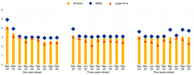 Euro area firms’ median inflation expectations were broadly unchanged at 2.6% for the one-year horizon and at 3% for the three and five-year horizons (Chart 17 in Section 3). Median one-year-ahead inflation expectations were at 2.6% (up from 2.5%), with SMEs expecting higher inflation (2.9%) than large firms (2.4%, Chart 19). SMEs did not revise their expectations for the three-year horizon (stable at 3.1%), while large firms slightly decreased their expectations (to 2.4%, down from 2.5% in the previous survey round). SMEs slightly decreased their inflation expectations to 3.7% (down from 3.8%) for the five-year horizon, while for large firms the decrease was more pronounced (to 2.3%, from 2.7%).