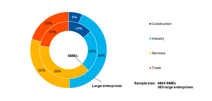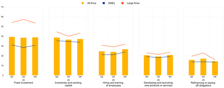 Financing from external and internal sources continued to be used primarily for fixed investment and for inventories and working capital (Chart 4 in Section 2). Fixed investment remained the most common use of financing (39% of firms), particularly among large firms, while usage among SMEs showed a slight increase (31%, up from 28%). Financing for inventories and working capital remained broadly stable (a net 37% of firms).