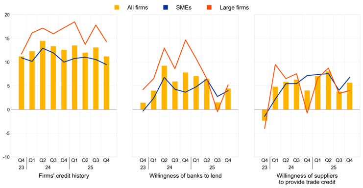 An indicator of overall firms’ financing conditions constructed using firms’ responses shows a slight tightening in the fourth quarter of 2025 (Chart A in this section). The indicator reflects firms’ perceptions of price-related terms and conditions of financing, including changes in bank interest rates and other bank-related costs such as charges, fees and commissions.[3] In this survey round, the indicator confirms a slight tightening in firms’ overall financing conditions, reported to a similar extent by both SMEs and large firms.