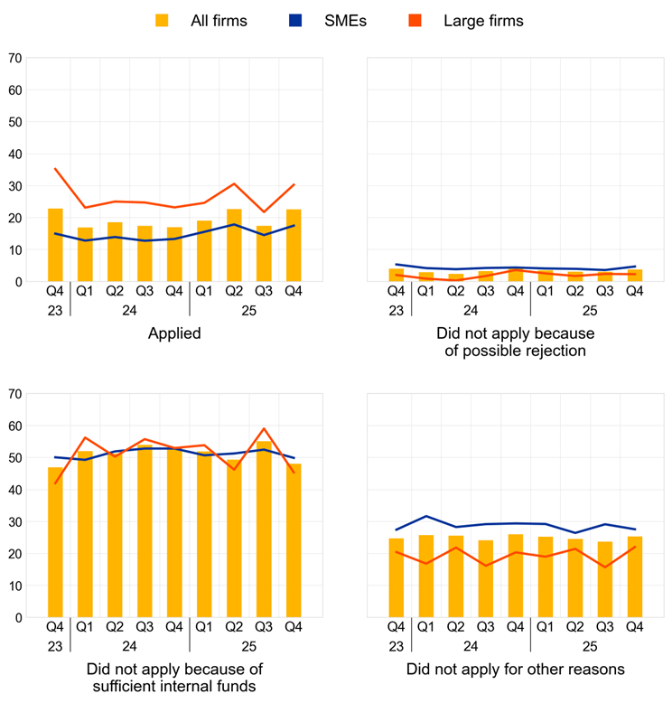 The share of firms applying for bank loans increased (Chart 8 in Section 2). In the fourth quarter of 2025, the share of bank loan applications increased to 23%, from 17% in the previous quarter. For firms that did not apply for bank loans, the most frequently cited reason was that they considered their internal funds to be sufficient to support their business plans.