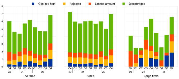 Firms continued to perceive the general economic outlook to be the main factor constraining the availability of external financing (Chart 6 in Section 2). In the fourth quarter of 2025, a net 20% of firms reported that a worsening in the general economic outlook had negatively affected the availability of external financing, from a net 19% in the third quarter of 2025. Firms reported a somewhat more negative impact of their firm-specific outlook on financing availability.